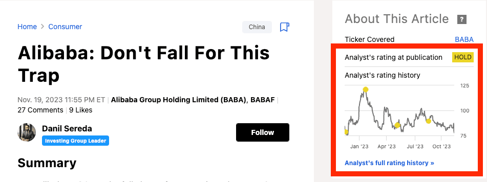 Intuitive Sidebar with Key Insights: Each article includes a sidebar offering quick access to the current stock chart, the author's historical rating accuracy, and collective ratings from Seeking Alpha, Wall Street, and the SA Quant rating.