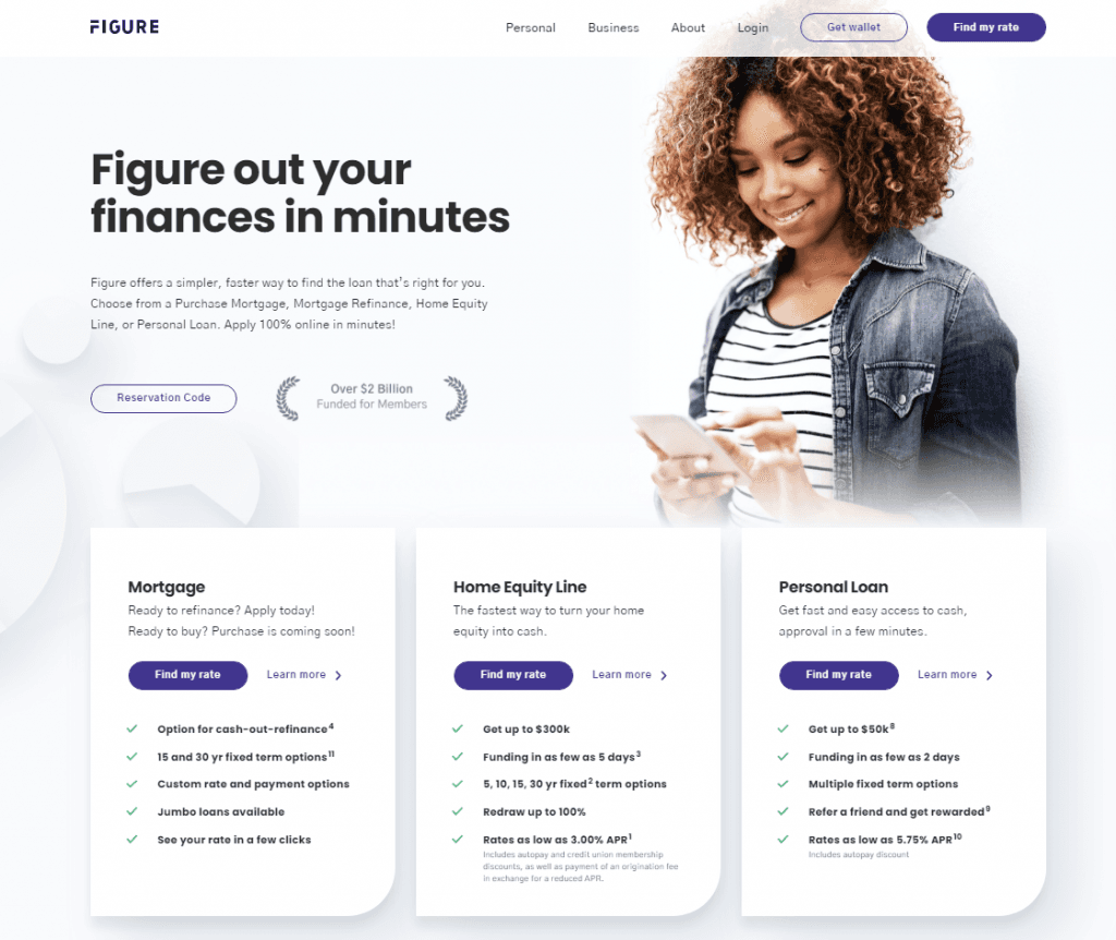 Figure Home Equity Line is available in AK, AL, AR, AZ, CA, CO, CT, DC, FL, GA, IA, ID, IL, IN, KS, LA, MA, ME, MI, MN, MO, MS, MT, NC, ND, NE, NH, NJ, NM, NV, OH, OK, OR, PA, RI, SD, TN, VA, VT, WA, WI, WY. Figure Mortgage Refinance is available in AK, AL, AR, AZ, CA, DE, FL, GA, IA, ID, IN, KS, LA, MA, MI, MO, MS, MT, NC, ND, NE, NH, NJ, NM, NV, OH, OK, PA, SD, TN, WA, WI, WV. Figure Personal Loan is available in AK, AL, AR, AZ, CA, CO, CT, DC, DE, FL, GA, HI, IA, ID, IN, KS, KY, LA, MA, ME, MI, MN, MO, MT, NC, ND, NE, NH, NJ, NM, NV, NY, OH, OR, RI, SC, SD, TN, TX, UT, VA, VT, WA, WI, WV, WY. More states will be added for all offerings over time.